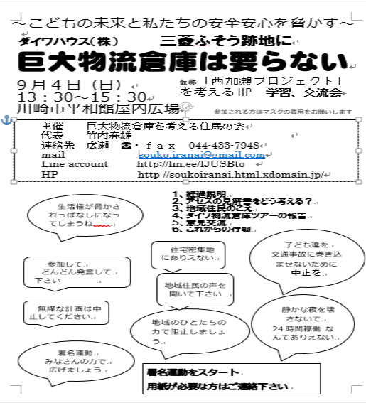 9月4日、「西加瀬プロジェクト(巨大物流センター建設)を考える学習会」が、川崎市平和館の屋内広場で開催されました。